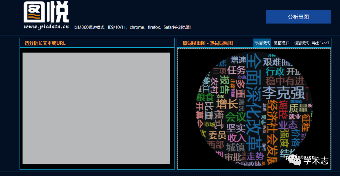 图悦是一款在线的热词分析工具,它可以对于载入文本或指向文本内容的链接进行词频提取和词语(重要性)权重分析,并可以导出成excel格式的文件,便于后期分析和处理。