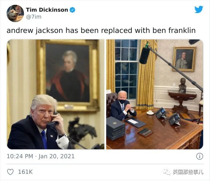 把办公室中安德鲁·杰克逊的肖像换成了本杰明·富兰克。