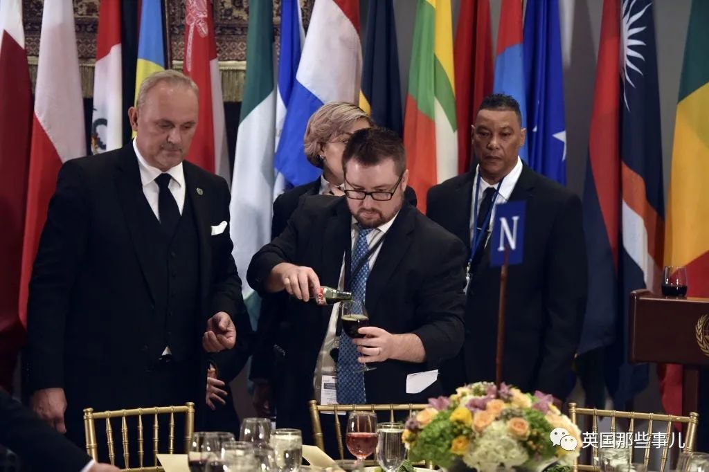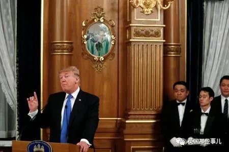 出访日本发表演讲,服务生在后面端着一杯可乐等着。