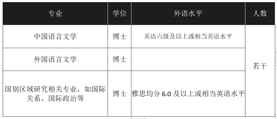 具有中国语言文学、外国语言文学或国别区域研究相关学科博士学位,年龄35岁以下,对业绩突出的应聘者可适当放宽条