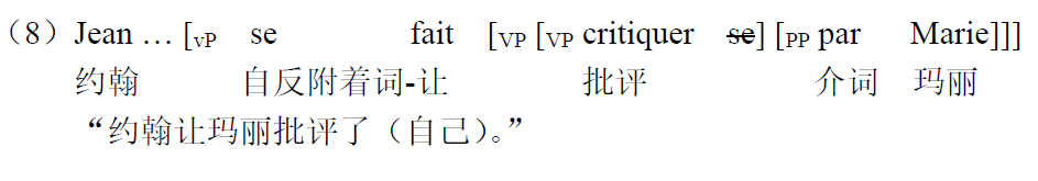 在此基础上,faire-par致使句式可以借由反身附着词se的附着提升(clitic climbing)转换为被动句式,如(8)所示。