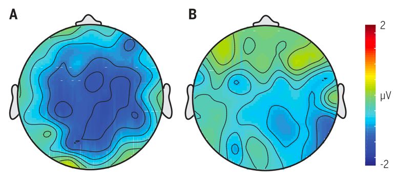 图3. 当新输入的语义信息与大脑预测不一致时引发的N400响应的脑地形图分布。(A)当新输入的信息是语句中核心成分时N400响应较为显著(顶叶蓝色部分);(B) 当新输入的信息不是语句中核心成分时,N400响应不显著。(Wang and Hagoort, 2011)