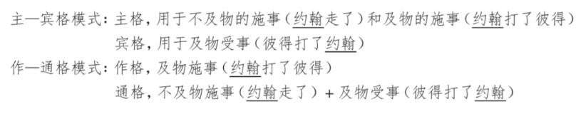 此外,还有其他一些配置方面和论元表现的差异。以给予义为原型的双及物结构中动 词支配两个宾语类论元,一个是被转移的物品等,称客体;一个是接受者(或被剥夺者),称与事。两者在格关系上也形成了两种模式: