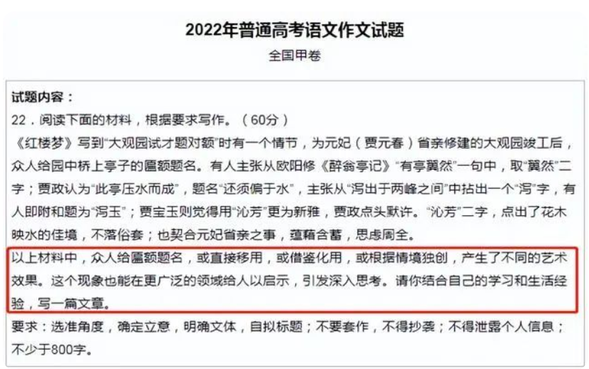 2022各地高考作文出炉,《红楼梦》登上全国卷