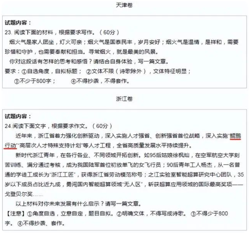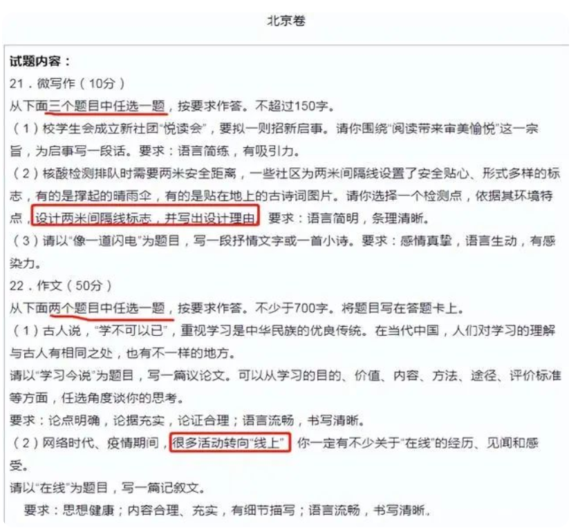 北京卷比较人性化,学生可以自选题目,也是今年唯一一个把疫情纳入考卷的地区。考题贴近生活又创意十足,无论是做核酸检测还是上网课,学生都有大把的感悟可以写。总的来说,除了全国甲卷和新高考1卷的作文以外,其他作文题难度还是可以接受的。