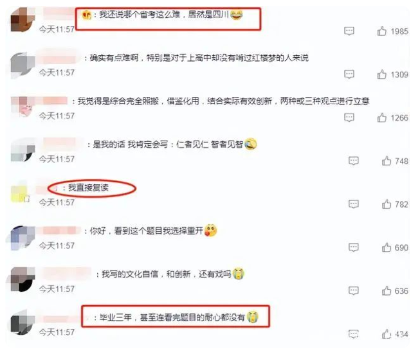 本来以为关注高考作文题目的,应该是即将面临高考的高一高二学生,结果评论区里都是来“凑热闹”的大学生。大家纷纷开始讨论各个省份的题目的难易程度,大学生们笑了:幸亏毕业得早。