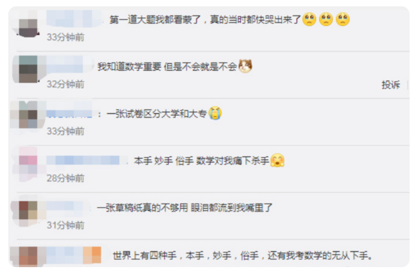本来有的考生语文考还算不错,考数学之前的心情也很不错,但是等到考数学的时候,差点做题做崩溃,基本上没有多少是会的。