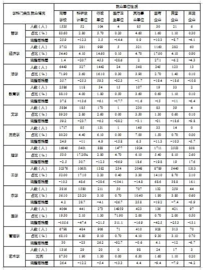 理学、工学、农学的博士毕业生相对于其他学科门类的倾向于选择科研设计单位就业;经济学、法学、管理学的博士毕业生相对于其他学科门类的更倾向于选择行政单位就业;医学博士毕业生相对于其他学科门类的倾向于选择医疗卫生单位就业;经济学、工学博士毕业生相对于其他学科门类的倾向于选择国有企业就业;理学、农学博士毕业生相对于其他学科门类的倾向于选择其他事业单位就业。除此以外,理学、工学博士毕业生相对于其他学科门类还倾向于民营企业和三资企业就业。