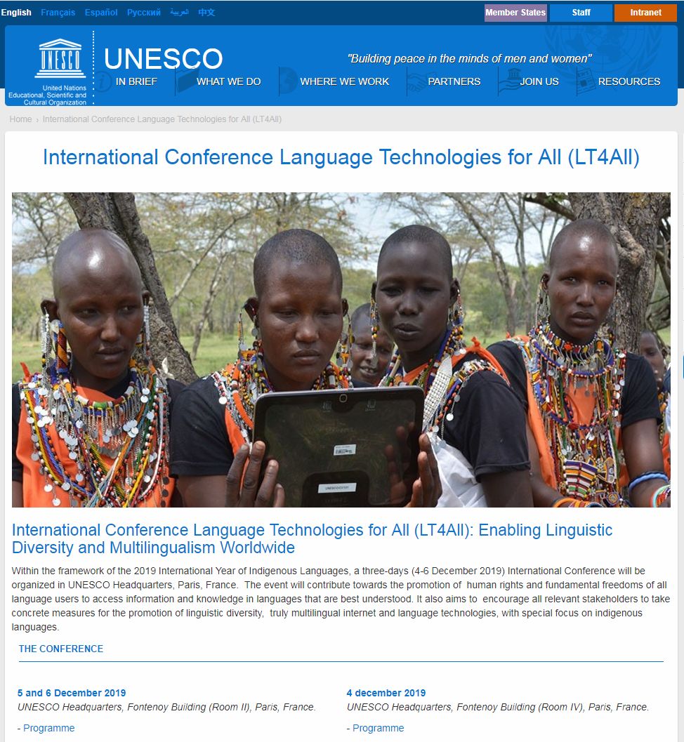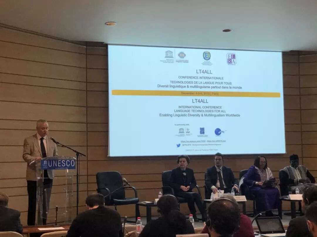 大会官网(可下载会议手册)https://en.unesco.org/LT4All2019年12月4—6日,中国社会科学院语言研究所副所长李爱军研究员和王伟副研究员参加了在法国巴黎联合国教科文组织(UNESCO)总部举行的“面向大众的语言技术”(Language Technologies for All, LT4All)国际会议。本次会议属于联合国2019“土著语言国际年”(2019 International Year of Indigenous Languages)系列活动的一部分,主办方除联合国教科文组织之外,还包括俄罗斯联邦汉特-曼西斯克自治州政府以及欧洲语言资源委员会(ELRA)。参加会议的400多位代表来自75个国家,参会者背景涵盖语言学、政府语言规划、少数民族语言文化研究、语言技术和人工智能、网络和信息技术等不同相关领域。