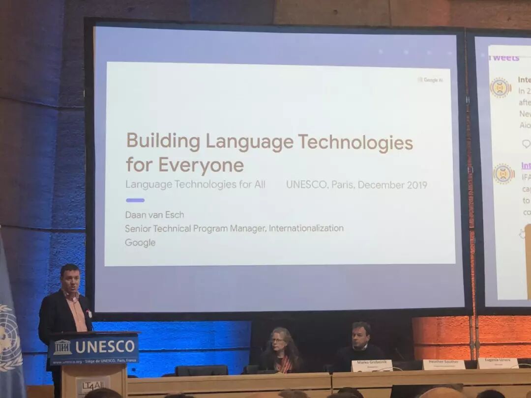 大会的创始私营赞助方谷歌公司高级技术项目经理Daan van Esch做了题为“建设语言技术服务大众”的当日主旨演讲。