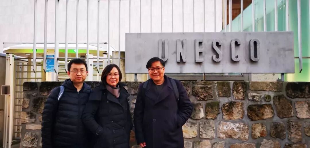 中国代表团三位成员在联合国教科文组织巴黎总部门前合影留念,三位代表(左起)分别为:王士进、李爱军、王伟