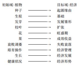 生老病死是自然界不变的法则。植物亦是如此,种子落入泥土,破土而出,生根发芽,开枝散叶,枝繁叶茂,开花结果,最后枯萎凋零,回归自然,化作春泥更护花。植物在生长的过程中,也会受到虫害侵袭,危及健康。在人类的进化史上,早在远古时代植物就与人类的生产生活密切相连。人们攀爬树木,采摘果实,收集种子,种植庄稼。早期的房屋建筑也以木制为主,可以说植物维持着早期人类的生存和繁衍。植物隐喻就是人类在生产生活中通过对植物的体验互动和认知加工形成的概念作为源域来映射到抽象的、不易理解的靶域,从而达到对靶域的理解。人们对植物生长过程的观察和思考及对其构成部分关系的认识,都被用来建构经济这一更为复杂的概念域;与植物相关的要素也成为靶域的重要构成部分,如图1所示。