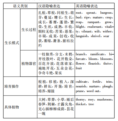 国内学者近年来多从英汉对比的视角探讨植物隐喻。陈映戎(2012)分别从《现代汉语词典》《现代汉语成语词典》《汉语惯用语词典》等词典中收集相关的植物隐喻语料,发现汉语植物隐喻358个,英语植物隐喻214个。孙毅、张瑜(2018)探讨和对比了汉英两种语言中植物意象如何通过隐喻映射到人和周围的事物,阐释了人类对植物认识的趋同和分歧。也有研究针对特定文学作品中的植物隐喻进行系统对比,如朱崇科(2017)对鲁迅《野草》中的植物系统隐喻进行了探究,谢世坚、韦冬梅(2018)对比了莎士比亚十四行诗和《诗经·国风》中的植物隐喻。