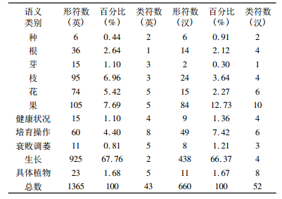 表1. 汉英植物隐喻语义类别及形符、类符数