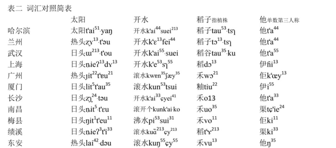 表二是从“词汇对照表”任意选取“太阳、开水、稻子指植株、他单数第三人称”等四个词语,这些词语都是各地方言的口语常用词;选取的比较地点也是哈尔滨等十一处方言。从这个简表里可以看出,“太阳”除了哈尔滨外,其他各地只有“日头、热头”两种说法,如果细究起来,很多地方“日”“热”同音,“热头”其实也是“日头”;“开水”除了梅县说“沸水”外,其他地点只有“开水、滚水”两种说法,“开水”多通行于北方官话地区,“滚水”主要通行于南方非官话地区;当植株说的“稻子”,除了厦门很特别说“粙”外,只有“稻”类和“禾”两种说法,也显示了南北方言的差别;当第三人称代词说的“他”,除了上海、厦门说“伊”外,也是只有“他”和“渠”两种说法,广州的“佢”是当地方言的习惯写法,从来历说其实也是“渠”。如果选取其他一些词语来比较,还会出现一些其他不同的情况,但总体的格局不会有很大的不同。