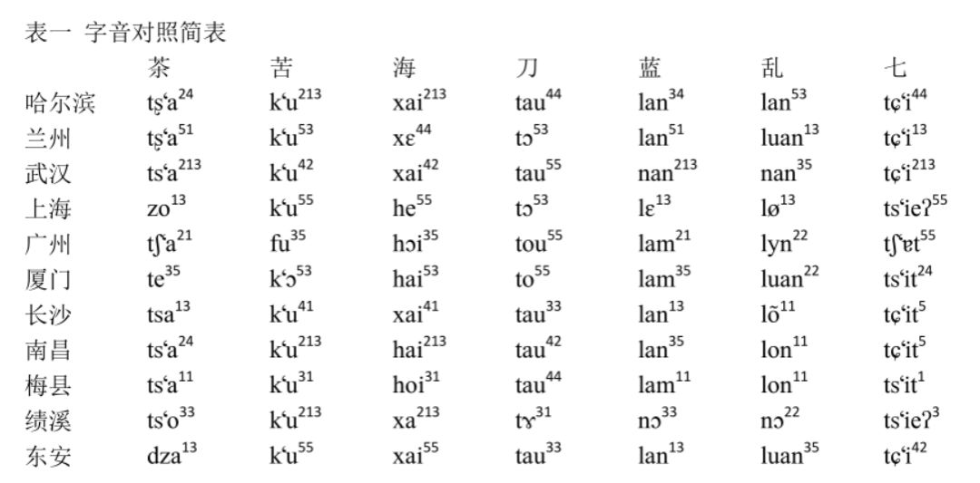 表一是从“字音对照表”中任意选取“茶苦海刀蓝乱七”等七个单字,这些单字在各地方言里一般也是可以单说的单音词;同时选取哈尔滨等十一处地点方言,这些方言分布南北各地,兼顾了不同方言区域。从这个简表里可以很清楚看出各地方言的异同,例如“苦”字除了各地声调有差别,广州声母、厦门韵母外,各地读音几乎完全相同。广州的[f]跟各地的[kÁ]厦门的[]跟各地的[u]是有严格的对应关系的,我们很容易类推出来。其他字的情况表面上看复杂一些,其实仔细分析跟“苦”字音读的情况差不了多少。要是选择其他字的读音
