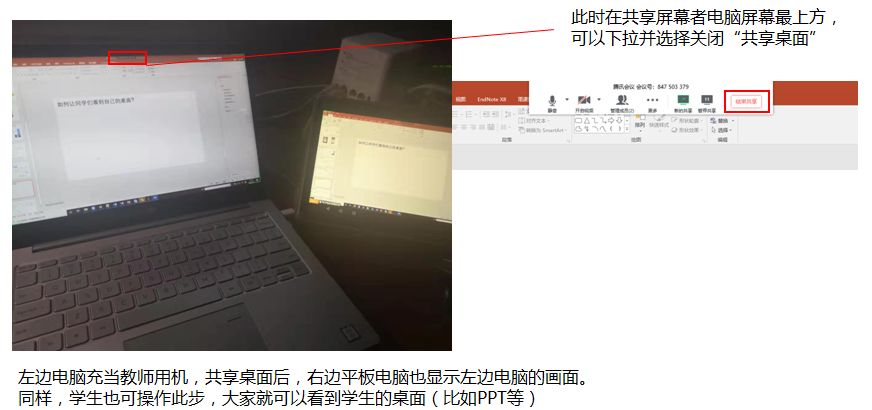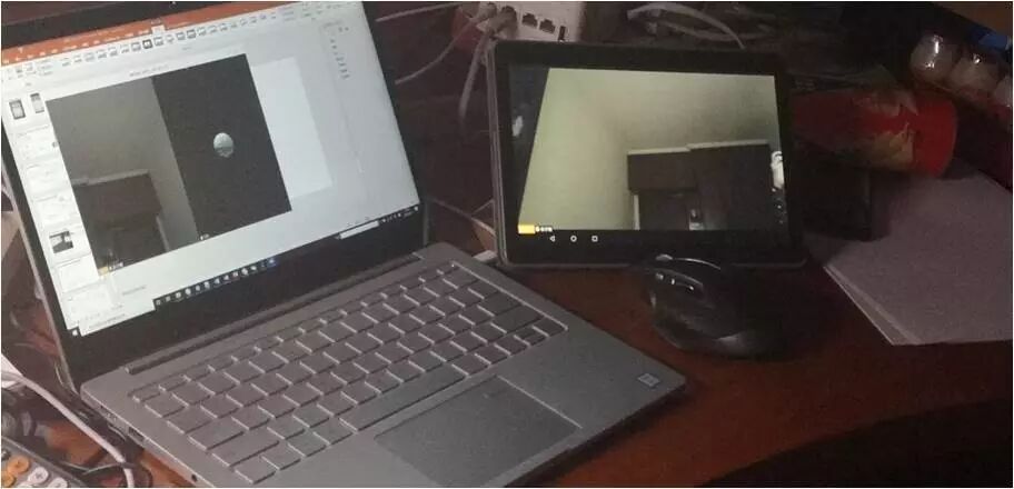左边电脑充当教师用机,开启视频后,右边平板电脑也显示左侧电脑的画面。