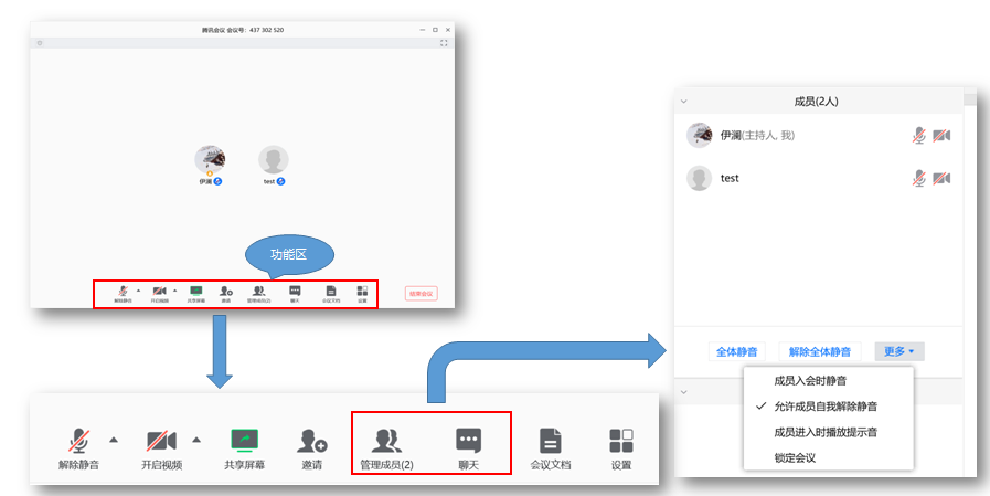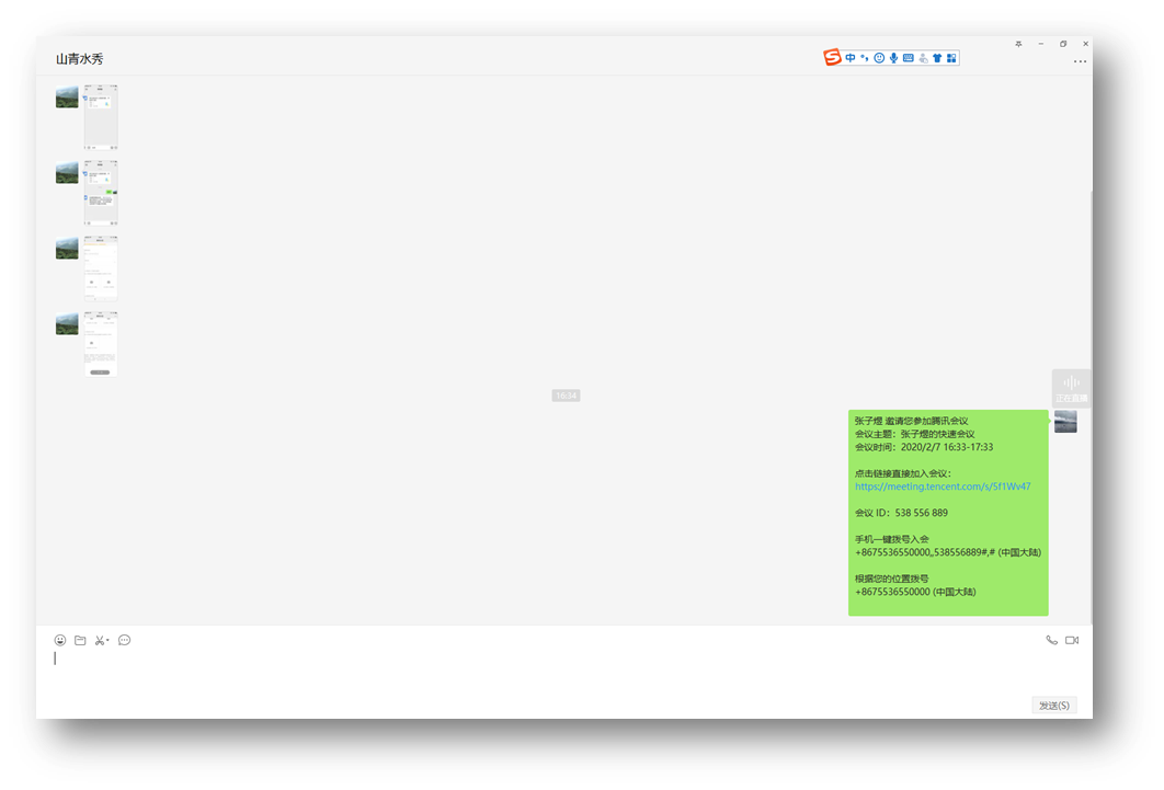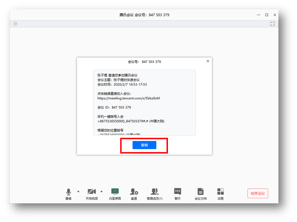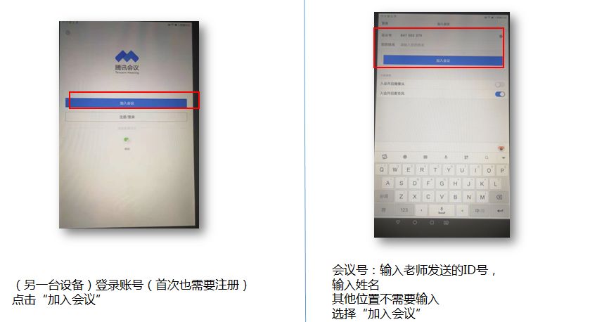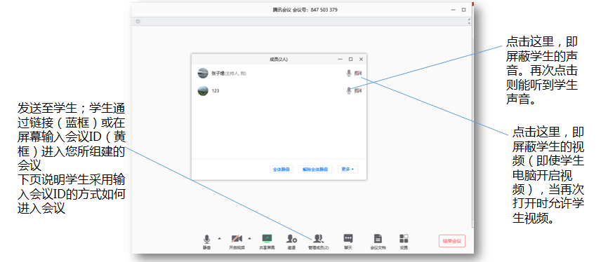 发送至学生;学生通过链接(左图蓝框)或在屏幕输入会议ID(左图黄框)进入您所组建的会议