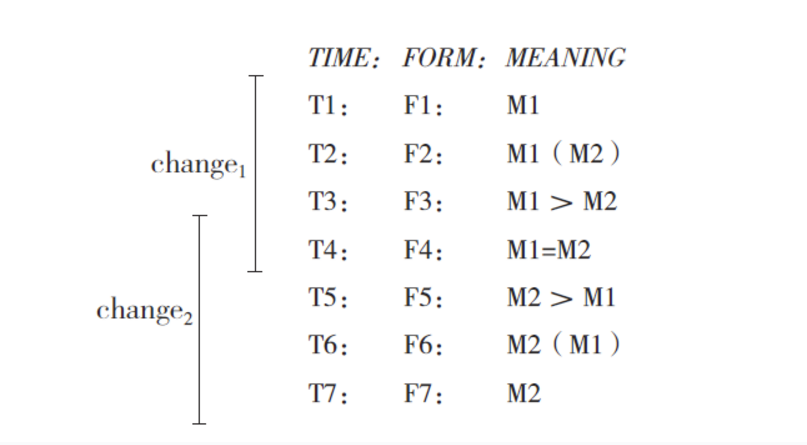 与Wilkins(1996:269)的主张极为相近的是Kearns(2002),后者认为语义演变本质上体现为(1)所示的两个过程: