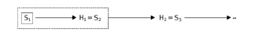 另一方面,在听者诱发的语义演变(hearer-induced meaning change)中,言者S1使用一个给定的词语来表达其规约意义,这时S1只是传递了该词语的字面意义,并没有进行任何语用或语义的创新,但听者H1却从S1的话语中“读出”该词语的新意义(听者的创新)。而且,在此后的言语交际中,该听者H1作为言者S2将这种创新传递给听者H2,而H2作为言者S3进一步将这种创新加以扩散,如此往复,直至该创新在特定言语社会中被规约化(Koch 2001:226–229;2012:283–287;2016:30)。如图4所示。