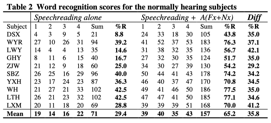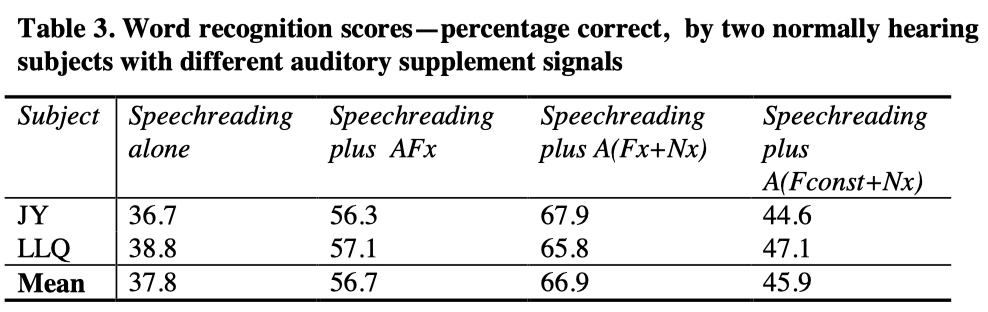 Word recognition results by normal hearing subjects with and without the supplement of compound speech pattern element signals A(Fx+Nx) to speechreading