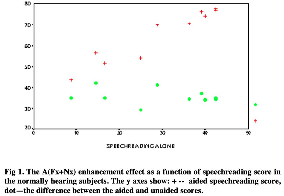 Boothroyd et al. (1988) reported that the enhancement effect of Fx, on average, amounts to a 40% increase of the correct percentage of words recognized in topic known sentences when the electroglottograph (EGG) signal was used as an auditory supplement to speechreading; and in normally hearing subjects, the existence of the Fx enhancement effect is independent of speechreading competence, however, the magnitude of the effect, expressed as percent reduction of error, tends to increase with increasing speechreading competence.