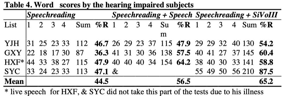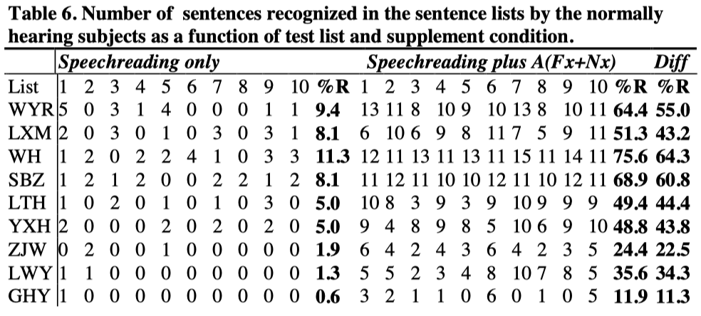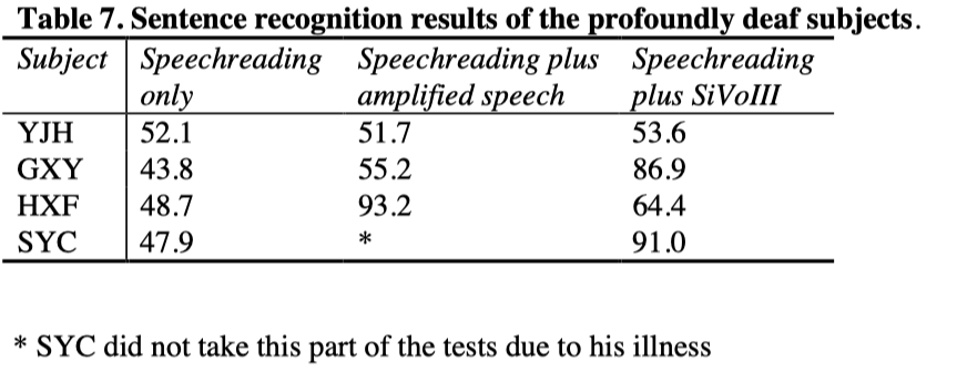 It will be seen from Table 7 that the prelingually deaf subject YJH did not obtain significant help from the auditory supplement. The other three deaf subjects were able to obtain substantial help from the auditory supplement of amplified speech and SiVoIII. To the subject GXY, SiVoIII gave more help than amplified speech, but to the subject HXF, amplified speech gave more help than SiVoIII. No data was collected on the subject SYC with the supplement of amplified speech.