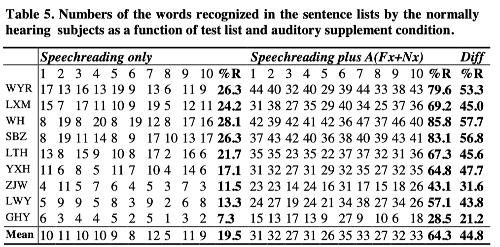 All the normally hearing subjects’ result were shown in the Table 5. It will be seen from Table 5 that all the subjects gained substantial benefits from the auditory supplement.