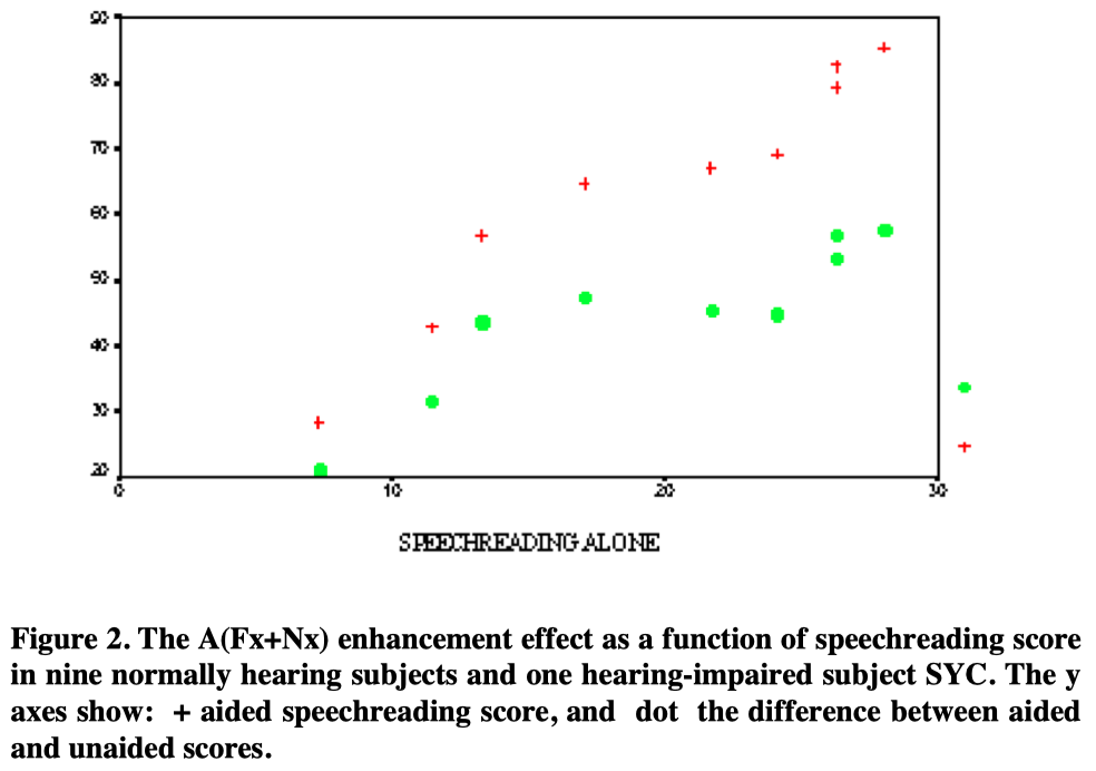 It will be seen that the enhancement effect was present for all subjects, regardless of unaided speechreading scores, even though the latter covered a range from 8.8% to 42.5%. When expressed as a difference of percentage score, the enhancement effect averaged 35.8 percentage points and is irrelevant to the subject’s speechreading ability(r=-0.192, p=0.59), but the aided performance is highly related to the unaided score (r=0.957, p<0.0005).