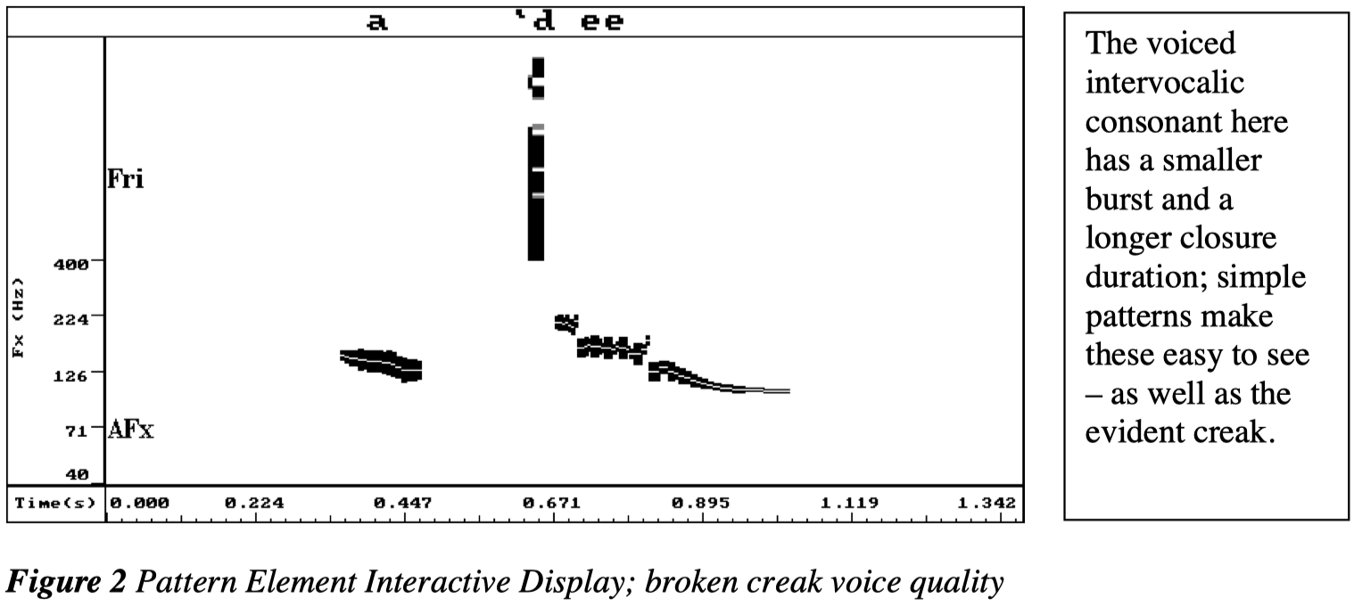 This very brief overview has concentrated on a limited number of the basic dimensions of speech contrasts. Many others are of daily clinical importance - voice quality and timbre for instance but this type of display is potentially available for all. Measurement can also be tied in to each of the categories. In summary, a list of possible practical advantages of pattern element processing might include:-