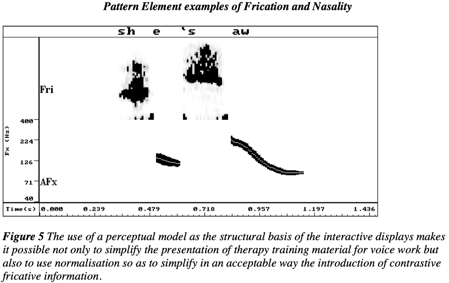 An advantage of the speech pattern element approach is that it allows the therapist to choose which individual feature or combination of features to work with depending on the problem in hand. The loudness-modulated pitch display, for example, can also have a visually normalised presentation of fricative elements to represent plosive bursts or the notoriously difficult sibilant fricative consonants.